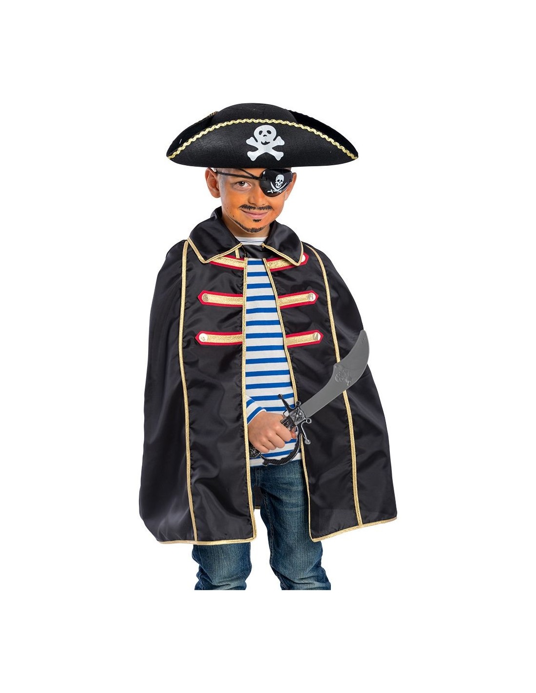 Questo mantello corsaro in taffetas nero trasforma ogni bambino nel più temuto pirata dei sette mari. Realizzato in taffetas resistente con eleganti bordature dorate, il mantello misura circa 60 cm di lunghezza ed è perfetto per completare qualsiasi costume da corsaro. Il mantello è l'elemento principale del set e permette movimenti fluidi durante il gioco. I dettagli dorati lungo i bordi aggiungono un tocco di eleganza da vero capitano pirata, mentre il tessuto in taffetas garantisce una vestibilità confortevole.