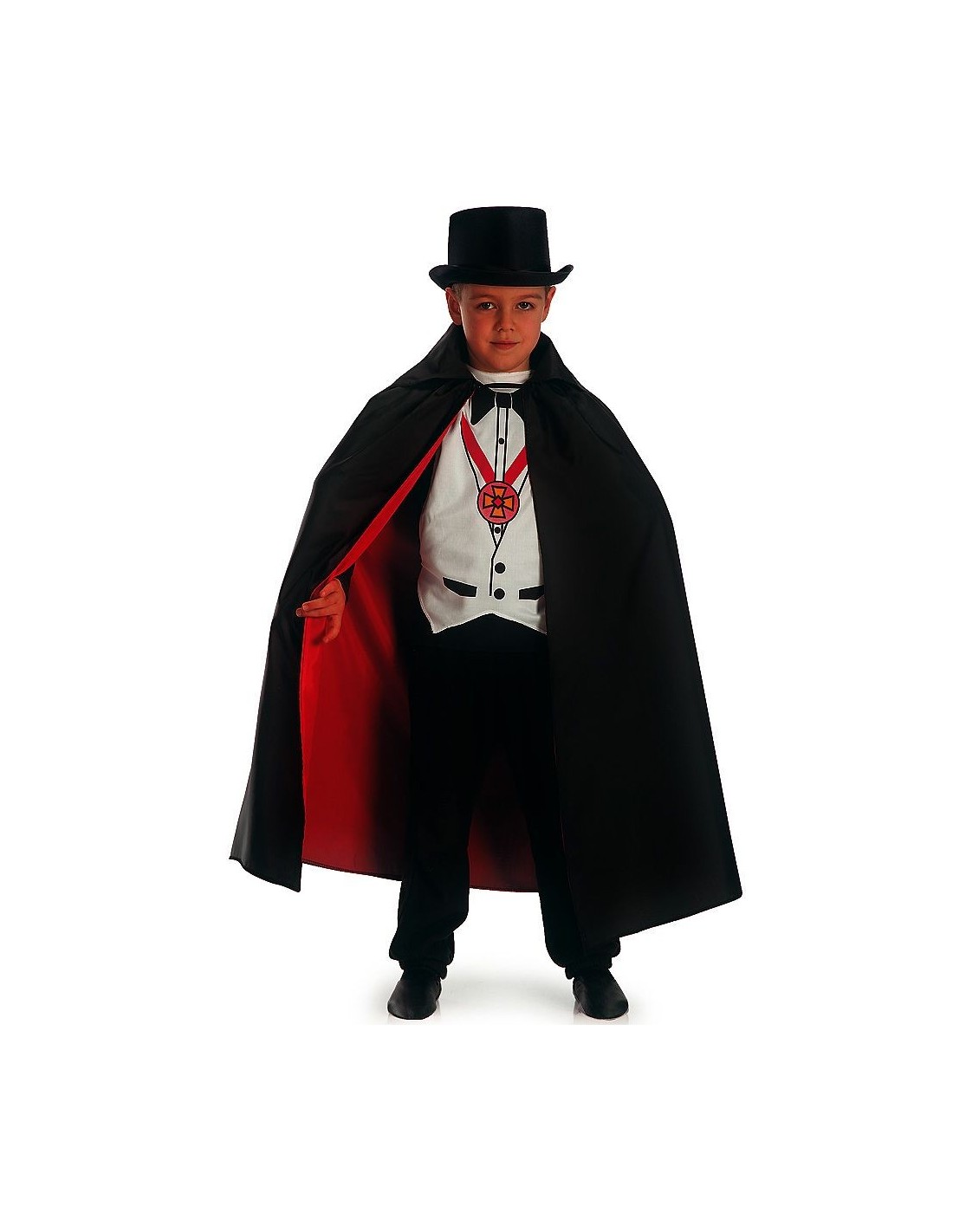 Trasforma il tuo bambino nel più elegante dei vampiri con questo affascinante mantello Dracula double-face in taffetas. Il mantello presenta un lato nero e uno rosso, creando un effetto scenografico perfetto, mentre la pettorina stampata con il classico medaglione di Dracula completa il look da conte vampiro. La lunghezza di circa 90 cm è ideale per i bambini, garantendo movimento e comodità durante le feste. Il mantello con pettorina è perfetto per ricreare l'atmosfera gotica dei film di vampiri più famosi.