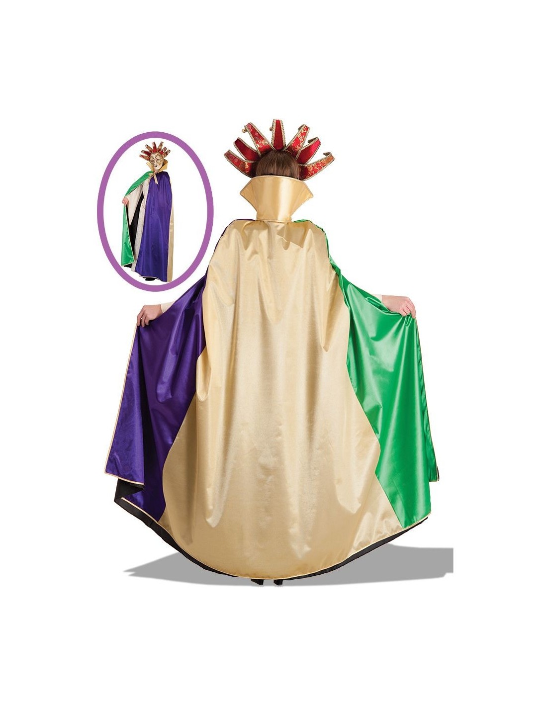 Magnifico mantello veneziano multicolor realizzato in rasetto e taffetas, lungo circa 140 cm. Questo splendido mantello presenta una combinazione di colori elegante con tonalità viola, verde e oro che richiamano la tradizione del Carnevale di Venezia. Il mantello è confezionato con tessuti pregiati che garantiscono una caduta elegante e movimenti fluidi. La lunghezza generosa di 140 cm circa dona maestosità alla figura e crea un effetto scenico di grande impatto.