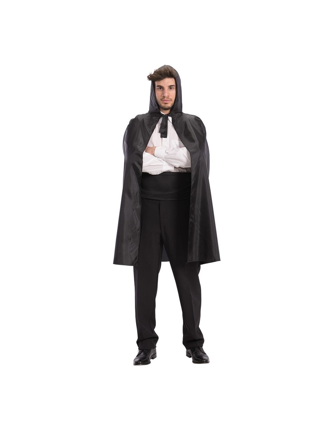 Mantello nero realizzato in raffinato taffetas, dotato di cappuccio e dalla lunghezza di circa 100 centimetri. Questo accessorio versatile si caratterizza per il tessuto lucido e la caduta fluida che dona un aspetto misterioso e affascinante. Il mantello presenta una chiusura pratica e il cappuccio aggiunge un tocco drammatico perfetto per molteplici travestimenti. La lunghezza media lo rende adatto a diverse corporature e si abbina facilmente con altri elementi per creare look completi.