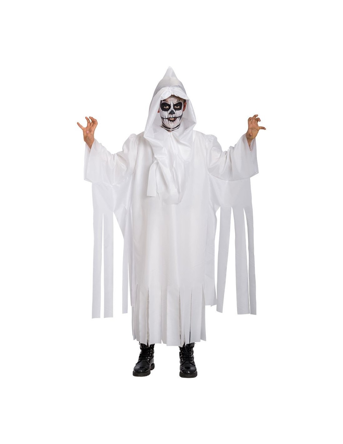 Trasforma il tuo bambino nel fantasma più spaventoso della festa con questo costume completo stracciato. Il set include una tunica bianca con cappuccio, caratterizzata da strisce stracciate che si muovono nel vento, e una maschera teschio con dettagli realistici. Realizzato in tessuto leggero e confortevole, garantisce libertà di movimento durante le feste. La vestibilità è studiata per bambini di 6-7 anni, con aperture laterali per facilitare l'indossamento.