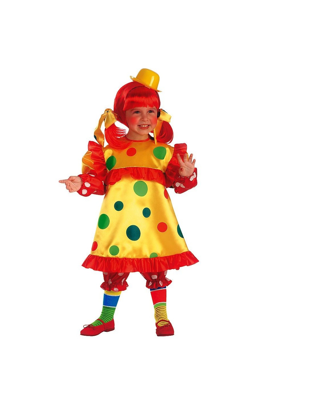 Il costume Bollicina trasforma la tua bambina in un allegro clown dai colori vivaci. Il set comprende un adorabile vestitino giallo decorato con grandi pois multicolori - rossi, blu e verdi - arricchito da dettagli e rifiniture rosse che creano un look festoso e divertente. Il costume include anche accessori coordinati per completare perfettamente la trasformazione. Realizzato in tessuti morbidi e confortevoli, garantisce libertà di movimento durante le feste e gli eventi. Le scarpe non sono incluse nel set.