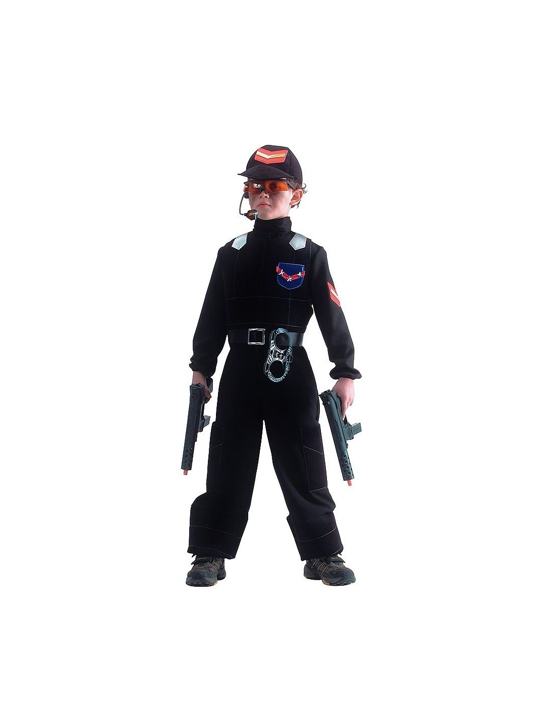 Il costume task-force si compone di una tuta nera completa con dettagli militari, cintura tattica, cappello con visiera e distintivi applicati. Realizzato in tessuto resistente, offre libertà di movimento per i bambini durante le attività ludiche. Il design realistico include elementi caratteristici delle forze speciali come tasche funzionali e finiture professionali che rendono il travestimento autentico e coinvolgente.