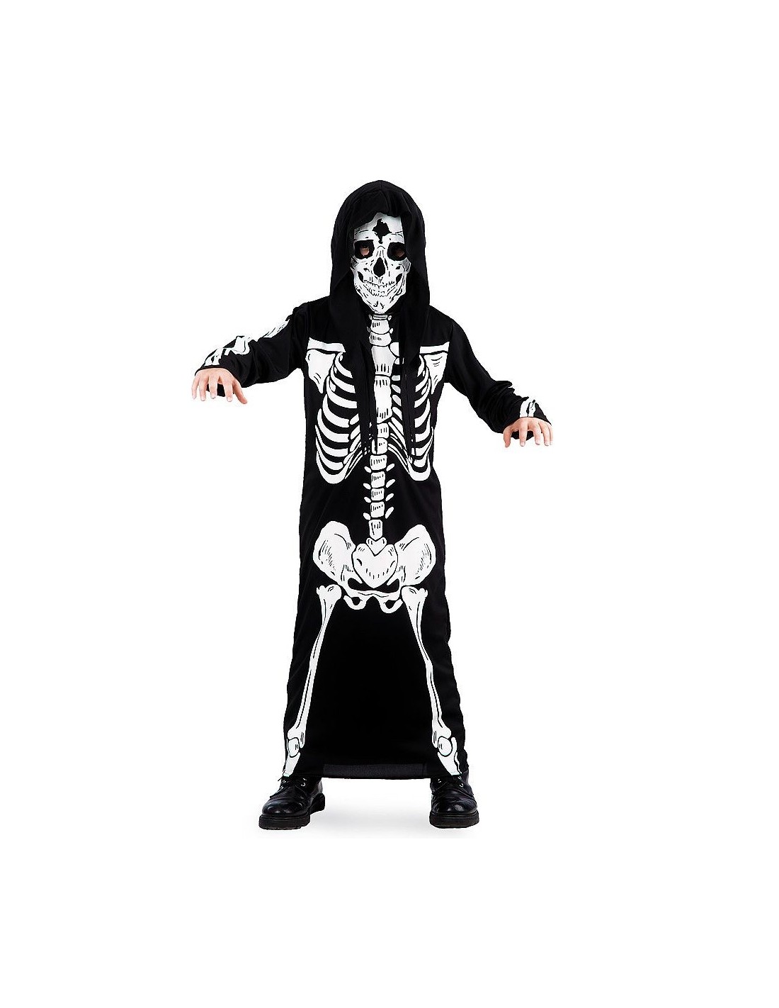 Trasformati nel più spaventoso scheletro della notte con questa tunica nera che riproduce fedelmente la struttura ossea umana. Il costume include una lunga tunica con cappuccio e stampa dettagliata di ossa bianche che si estende su tutto il corpo, dalla gabbia toracica al bacino e agli arti. Realizzata in tessuto leggero e confortevole, garantisce libertà di movimento durante le serate più animate. La vestibilità ampia si adatta perfettamente ai bambini di 6 anni.