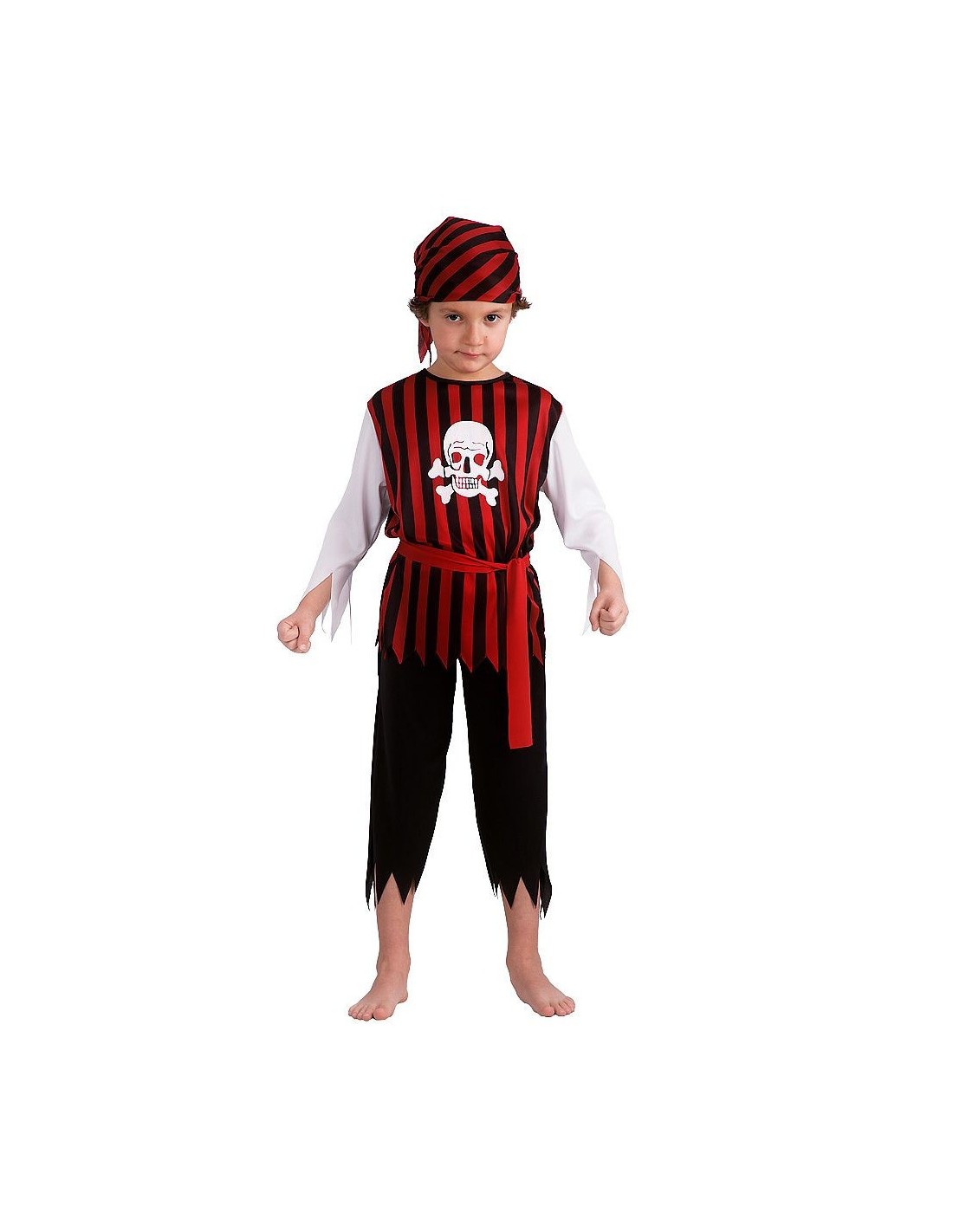 Trasformati in un audace corsaro dei mari con questo costume completo perfetto per bambini di 5 anni. Il set include gilet a righe rosse e nere decorato con teschio, pantaloni neri con orlo frastagliato, fascia per la vita e bandana coordinata. Realizzato in tessuto morbido e confortevole, garantisce libertà di movimento durante tutte le avventure pirata. La stampa del teschio sul petto aggiunge il tocco giusto per un look davvero convincente.