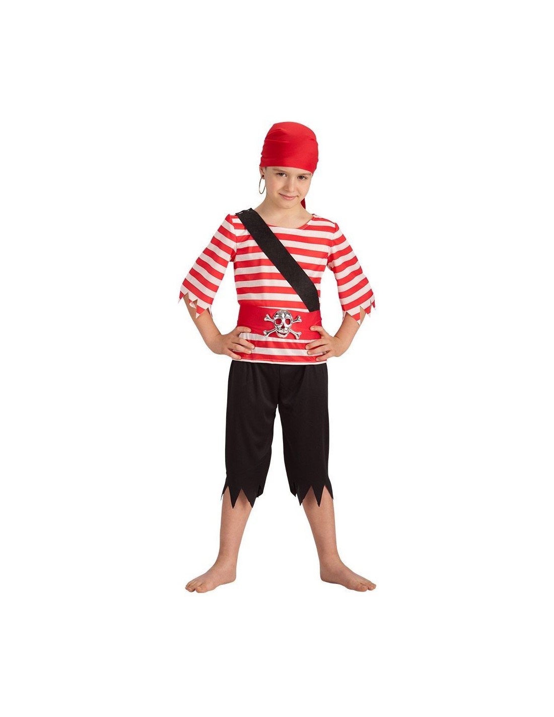 Diventa il pirata più temuto dei sette mari con questo fantastico costume completo per bambini! Il set include una colorata camicia a righe rosse e bianche con teschio stampato sul petto, pantaloni neri sfilacciati che ricreano perfettamente il look marinaro, una fascia nera che attraversa il petto e un pratico cappello rosso da pirata. I pantaloni hanno l'orlo volutamente strappato per un effetto autentico da corsaro. Il costume è pensato per bambini di 4 anni circa e garantisce comfort e libertà di movimento durante le avventure.