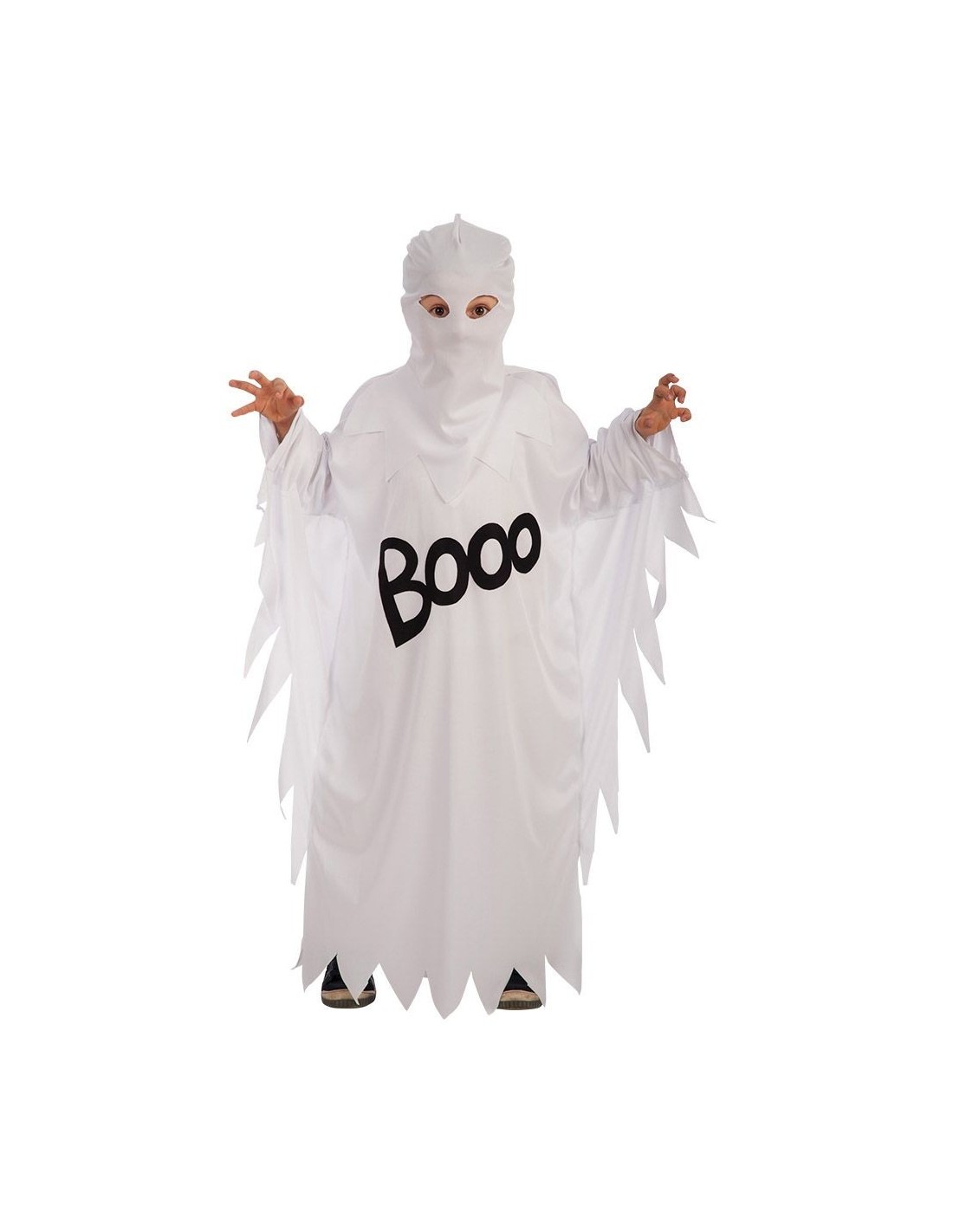 Il classico costume da fantasma che non passa mai di moda, perfetto per far divertire i più piccoli durante le feste di Halloween. Questo travestimento include un mantello bianco con cappuccio e la scritta 'BOO' sul petto, completato da frange sfilacciate che creano l'effetto spettrale tipico dei fantasmi. Realizzato in tessuto leggero e confortevole, permette ai bambini di muoversi liberamente durante le loro avventure da brivido. Disponibile in taglia unica VI-VII.