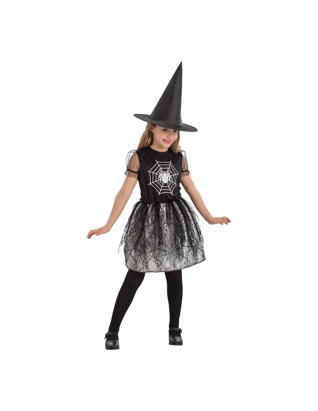 Il costume da streghetta ragno trasforma ogni bambina in una piccola maga dal fascino misterioso. L'abito nero presenta una stampa decorativa con ragnatela argentata che brilla sotto la luce, mentre la gonna in tulle crea un effetto vaporoso e magico. Il set include l'abito con maniche corte e il caratteristico cappello da strega a punta nera. Perfetto per bambine di 6 anni che vogliono incarnare una streghetta dal tocco gothic-chic. Le scarpe nere non sono incluse nel set.