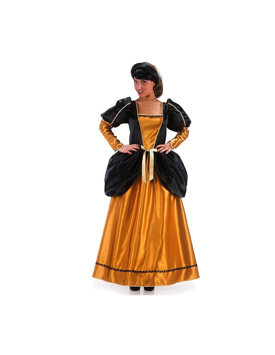 Magnifico costume medievale femminile che richiama l'eleganza delle dame rinascimentali. Il set comprende un sontuoso abito lungo con corpetto nero decorato da bordature dorate, gonna ampia color ambra e maniche a sbuffo rifinite con dettagli dorati. Il costume presenta una cintura in tessuto dorato che enfatizza la silhouette e crea un look regale e raffinato. Realizzato in tessuti morbidi e confortevoli, questo costume medievale garantisce libertà di movimento e vestibilità comoda.