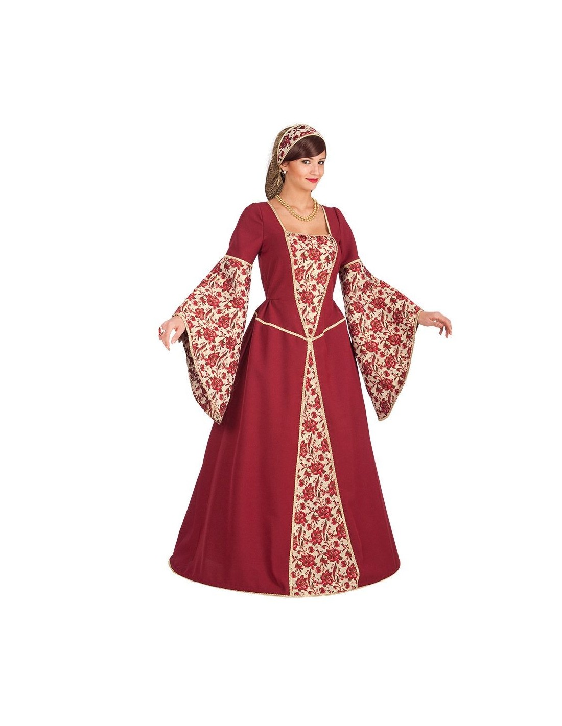Splendido costume medievale da nobildonna che ti trasporterà nell'epoca delle corti rinascimentali. L'abito presenta un elegante design bordeaux arricchito da inserti decorativi con motivi floreali dorati e rossi. Le ampie maniche a campana e la gonna lunga creano una silhouette maestosa e regale. Il corpetto aderente è impreziosito da lacci decorativi che completano il look d'epoca. Disponibile in taglia XL per una vestibilità comoda e confortevole.