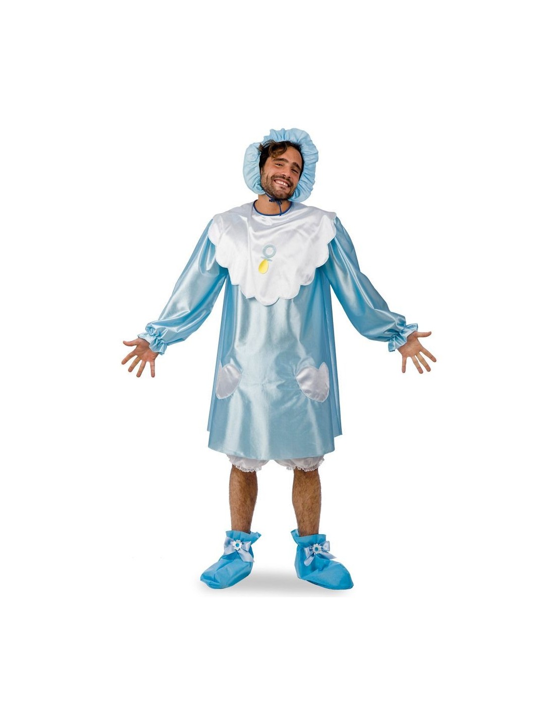 Questo adorabile costume da bebè azzurro trasforma chiunque in un tenero neonato pronto per far sorridere tutti. Il set include un'ampia tutina azzurra con maniche lunghe, un grande bavaglino bianco decorativo e una cuffietta coordinata. La vestibilità comoda permette libertà di movimento durante le feste, mentre i dettagli come i piedini a forma di scarpette completano il look infantile. Disponibile in taglia unica adatta per corporature M/L, questo costume divertente garantisce un travestimento originale e spensierato.
