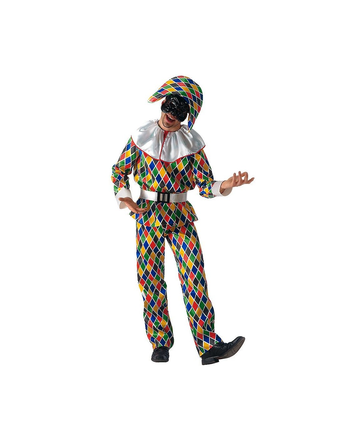 Il costume da Arlecchino rappresenta uno dei personaggi più iconici della Commedia dell'Arte italiana. Questo travestimento comprende una coloratissima tuta con il classico motivo a rombi multicolori, un cappello coordinato e un colletto bianco tradizionale. La fantasia geometrica presenta vivaci tonalità di rosso, verde, giallo e blu che si alternano in perfetto stile veneziano. Realizzato in tessuto morbido, garantisce libertà di movimento per danze e performance teatrali.