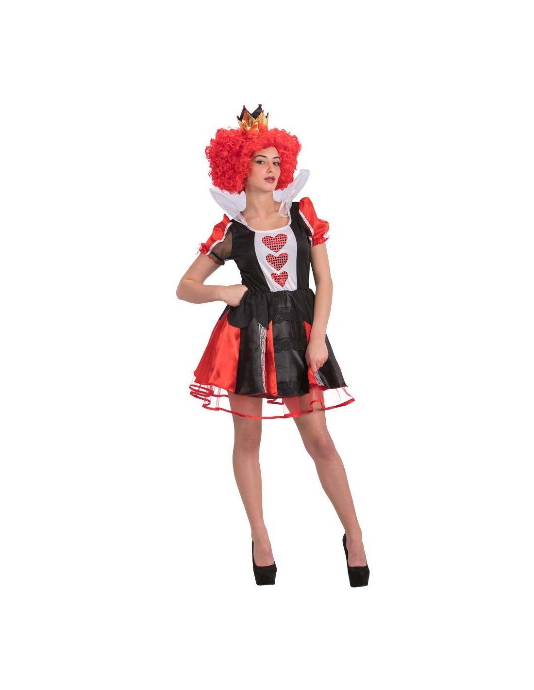 Trasformati nella temibile Regina di Cuori con questo splendido costume che ricrea perfettamente l'iconico personaggio di Alice nel Paese delle Meraviglie. Il set include un elegante abito nero e rosso con corpetto decorato da cuori rossi, gonna svasata con sottogonna rossa, e una magnifica corona dorata che completa il look regale. Disponibile in taglia unica che veste dalla S alla M, è realizzato in tessuto morbido e confortevole per garantire libertà di movimento durante tutta la serata.