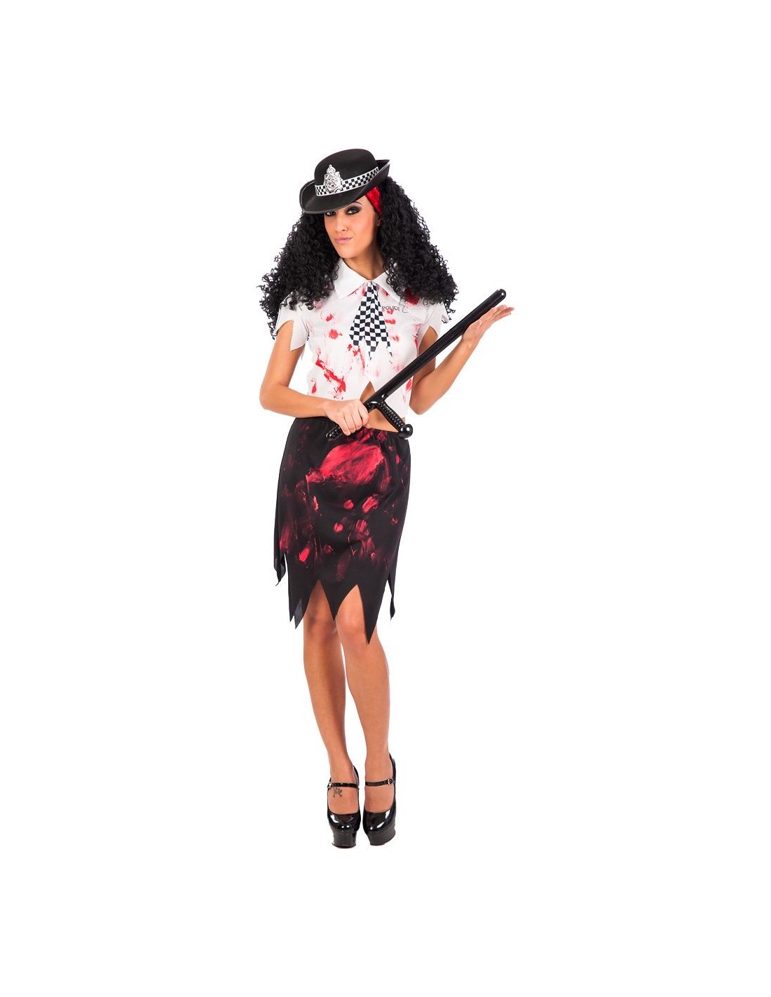 Trasformati in una terrificante poliziotta zombie con questo costume da brivido perfetto per Halloween. Il set include camicia bianca da poliziotta macchiata di sangue finto, gonna nera strappata con effetti sanguinolenti e cappello da agente delle forze dell'ordine. I dettagli horror rendono questo travestimento ideale per chi vuole stupire con un look spaventoso ma originale. Disponibile in taglia M, il costume si adatta perfettamente per creare un personaggio inquietante e memorabile.