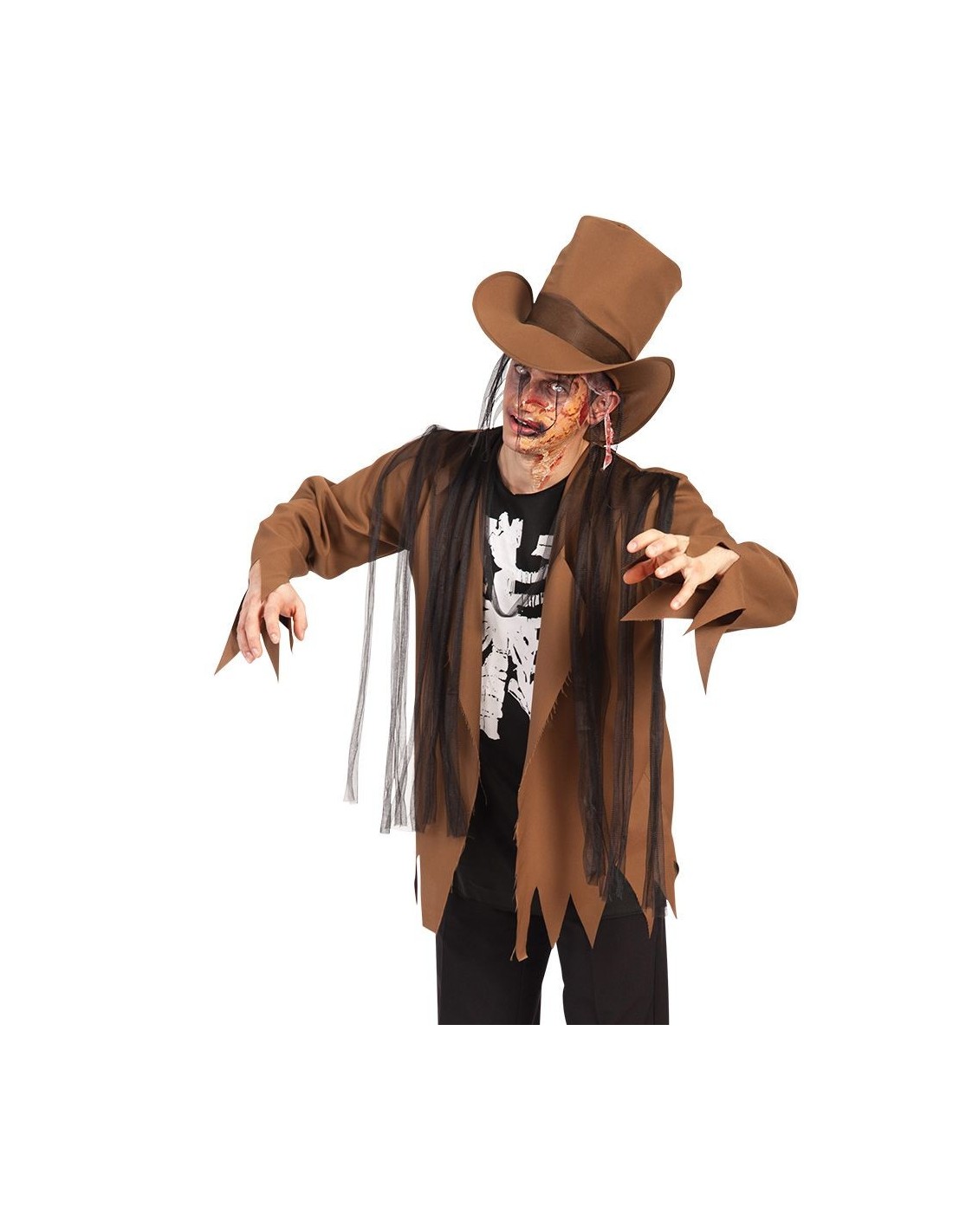 Trasformati in uno zombie terrificante con questo costume marrone completo che comprende giacca logora, camicia con stampa scheletro e cappello a cilindro. Il set è disponibile in taglia unica M/L per una vestibilità comoda e adattabile. I dettagli strappati e l'effetto invecchiato conferiscono un aspetto autentico da non-morto perfetto per spaventare durante le notti di Halloween.