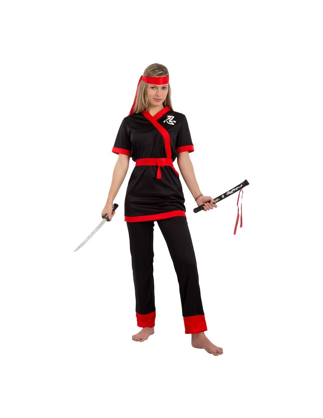 Questo affascinante costume da ninja donna ti trasformerà in una guerriera misteriosa e agile. Il set include una comoda tunica nera con inserti rossi, pantaloni coordinati, fascia per la testa e cintura. Il design presenta dettagli accattivanti con bordature rosse che risaltano sul tessuto nero. Disponibile in taglia unica che veste dalla S alla M, garantisce vestibilità comoda e libertà di movimento. Il costume è realizzato in tessuto morbido e pratico, perfetto per muoversi con agilità durante feste ed eventi.