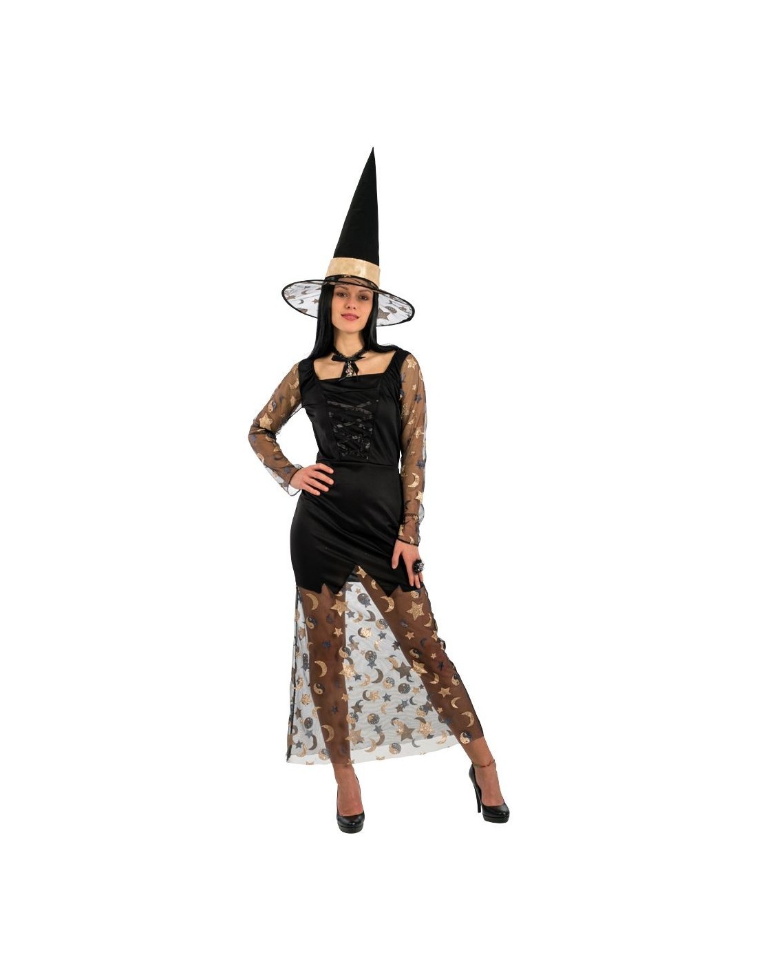 Trasformati in una maliarda dal fascino irresistibile con questo splendido costume da strega magica. Il set comprende un elegante abito nero con dettagli decorativi, maniche trasparenti e gonna lunga con inserti in tulle, completato dal classico cappello a punta nero con fascia dorata. Disponibile in taglia unica che veste dalla S alla L, questo costume presenta una silhouette femminile e raffinata che esalta la figura. Il design combina elementi tradizionali della strega con un tocco moderno e seducente.