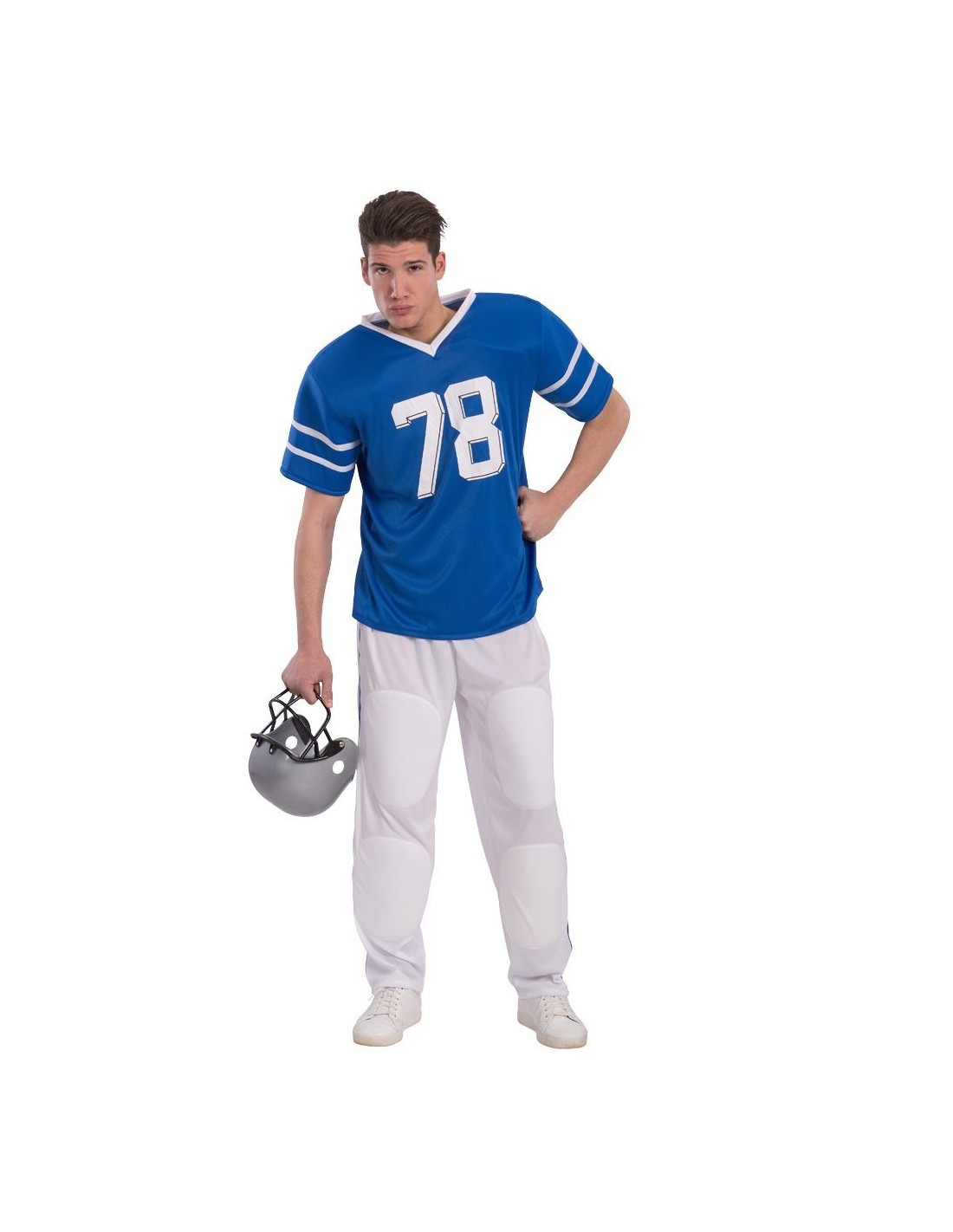 Trasformati in un autentico giocatore di football americano con questo costume completo che include maglia blu con numero 78, pantaloni bianchi e casco protettivo. La maglia presenta dettagli bianchi sulle maniche per un look realistico e sportivo. Disponibile in taglia unica che si adatta perfettamente alle taglie M, L e XL. Il design riproduce fedelmente le divise professionali del football americano, sport sempre più popolare anche in Italia.