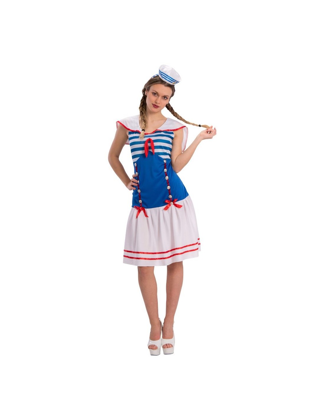 Trasformati in una perfetta marinaretta con questo delizioso costume in stile navy. Il set include un elegante vestito con corpetto blu a righe bianche, gonna bianca con bordi rossi e il caratteristico cappellino da marinaio. Il design presenta dettagli autentici come bottoni decorativi e fiocchetti rossi che richiamano l'iconico look nautico. Disponibile in taglia unica che veste dalla M alla L, perfetto per chi vuole incarnare il fascino del mare e della navigazione.