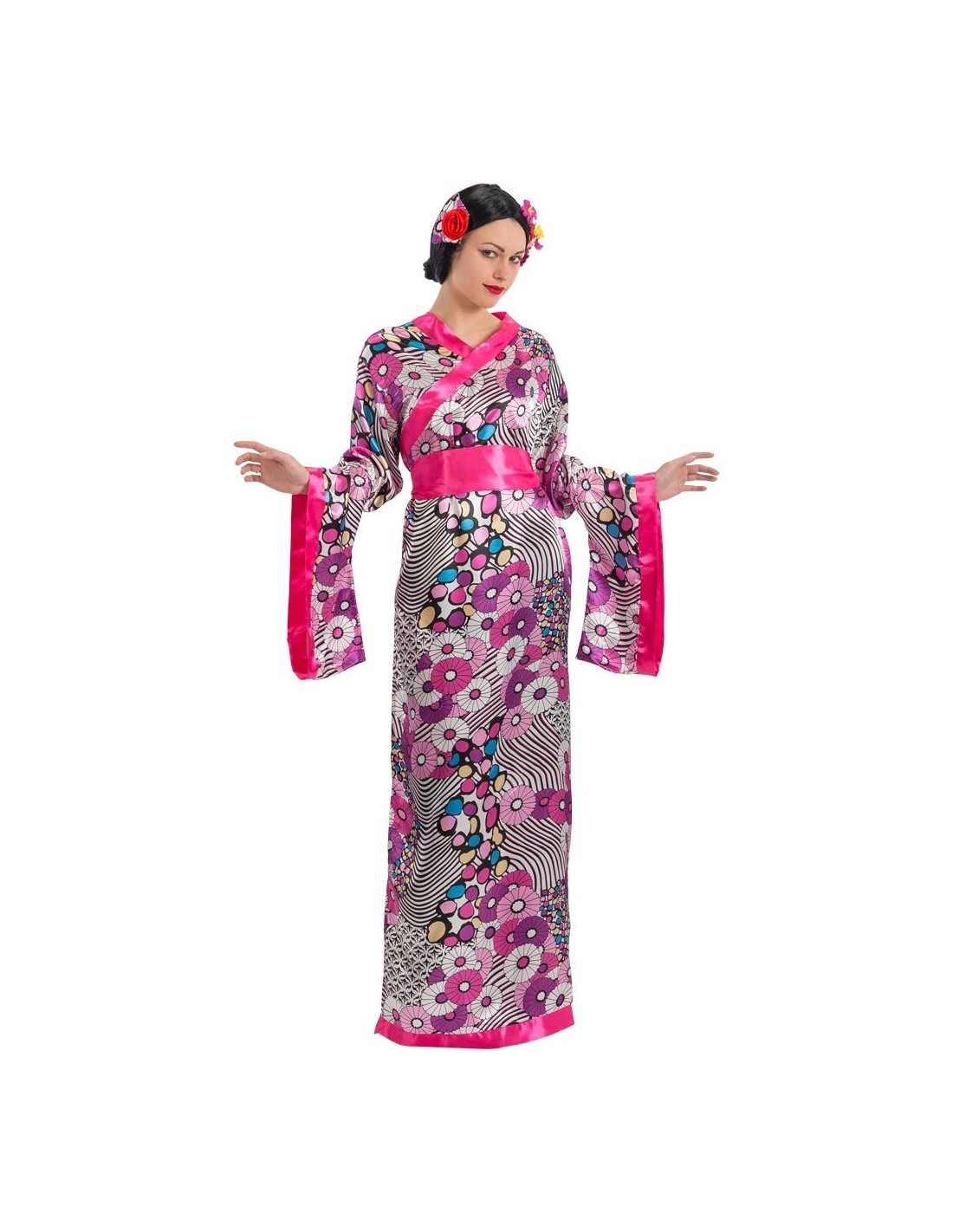 Trasformati in un'affascinante gheisha giapponese con questo splendido costume tradizionale. Il set include un lungo kimono decorato con motivi floreali e geometrici sui toni del rosa, grigio e nero, completato da un'elegante obi (cintura) rosa che esalta la silhouette. Le ampie maniche a kimono e il taglio tradizionale ricreano perfettamente l'atmosfera del Giappone antico. Disponibile in taglia unica adatta dalla M alla L, garantisce una vestibilità comoda e autentica.