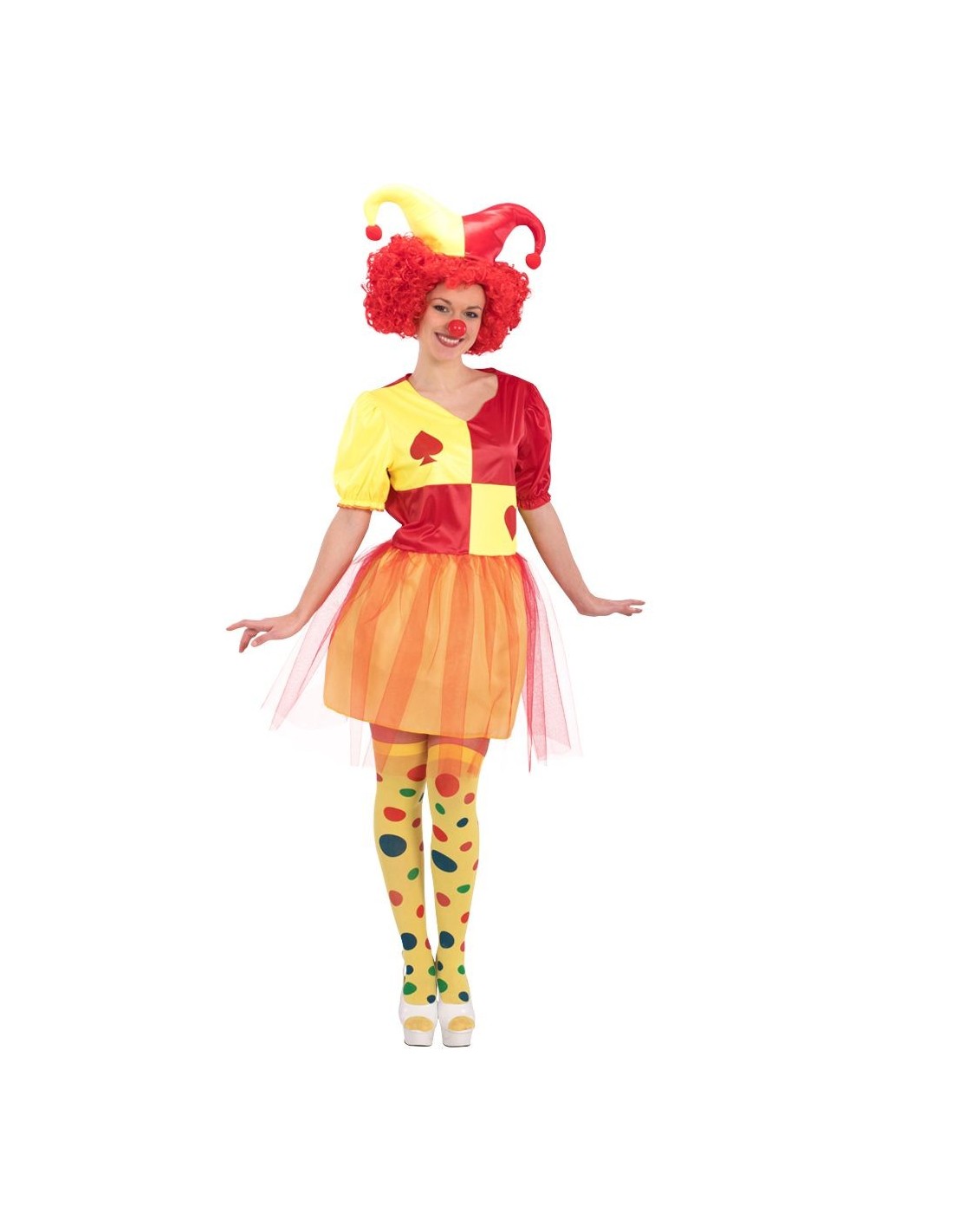 Trasformati in una vivace giullare con questo allegro costume femminile dai colori sgargianti. Il set include un delizioso vestito con corpetto bicolore rosso e giallo decorato da fiore, gonna in tulle arancione vaporosa e calze gialle a pois multicolori che completano il look festoso. Disponibile in taglia unica M-L, questo costume jolly girl presenta dettagli curati come il contrasto cromatico del corpetto e la gonna in tulle che dona movimento ad ogni passo. I colori vivaci e il design giocoso rendono questo travestimento perfetto per chi vuole portare allegria e divertimento.