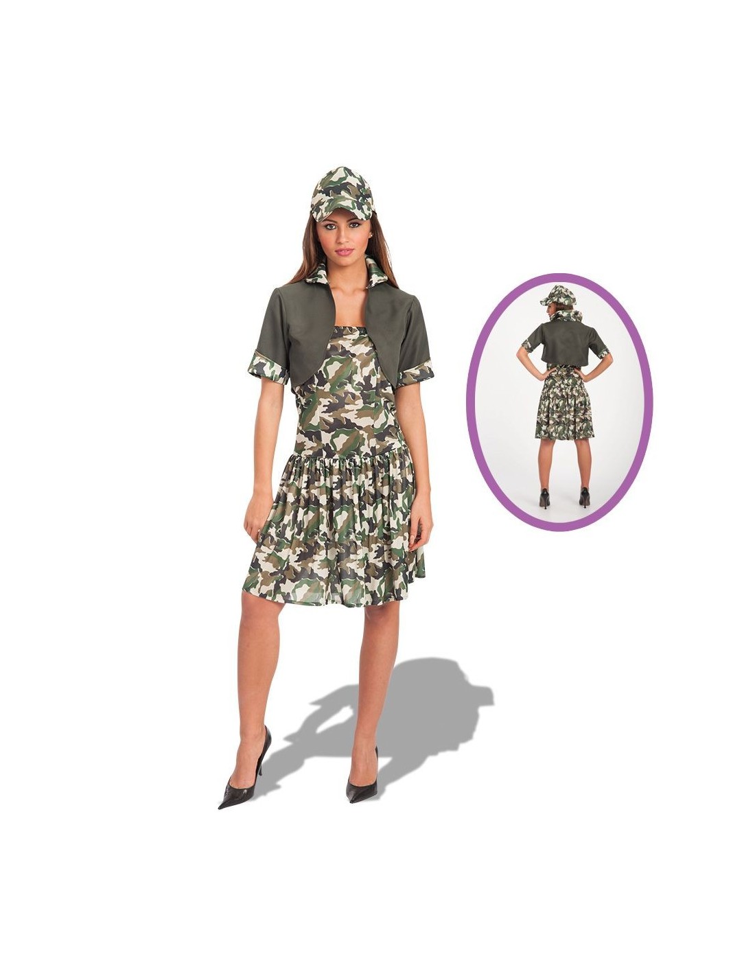 Trasformati in una vera soldatessa con questo costume militare completo che include divisa mimetica, berretto e cintura. Il set comprende una giacca militare verde oliva con dettagli mimetici, gonna abbinata e il caratteristico berretto da campo. Disponibile in taglia unica M/L, questo costume è perfetto per chi vuole indossare un look deciso e grintoso. La divisa presenta i tipici colori militari che rendono il travestimento realistico e d'impatto.